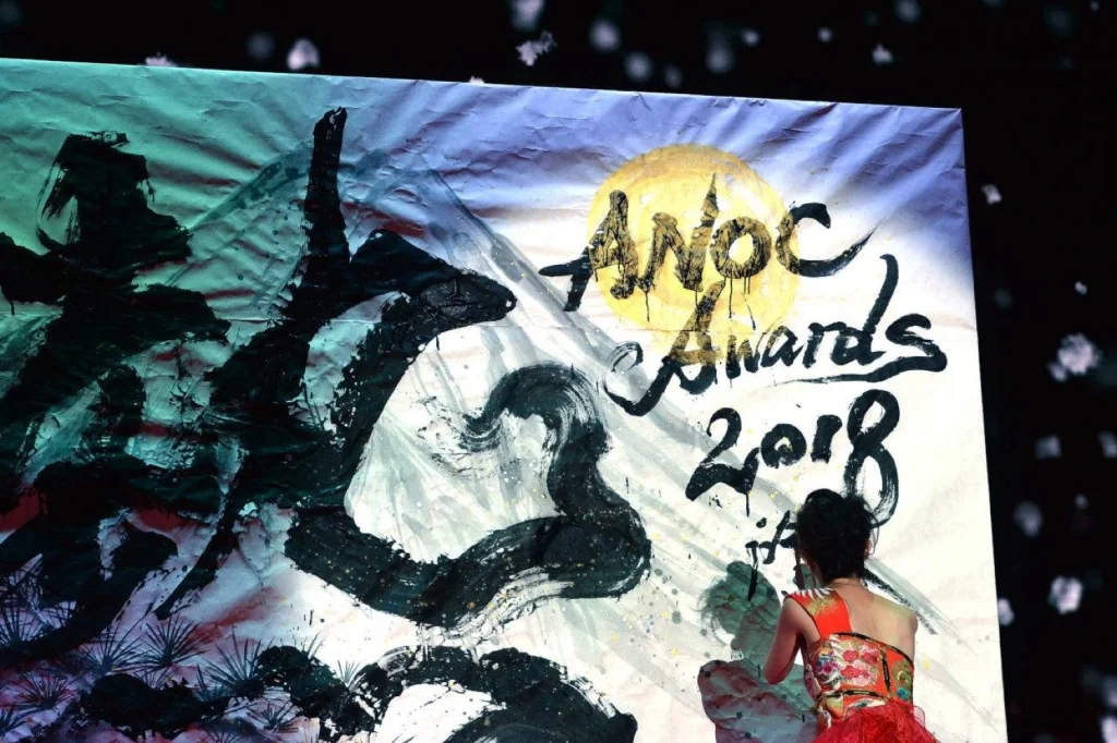 Accompanied by the live sounds of the **Shamisen** and **Shinobue** (Japanese bamboo flute), I wrote the word 「情熱」 (Jounetsu – Passion) along with the title “ANOC Awards 2018.”
