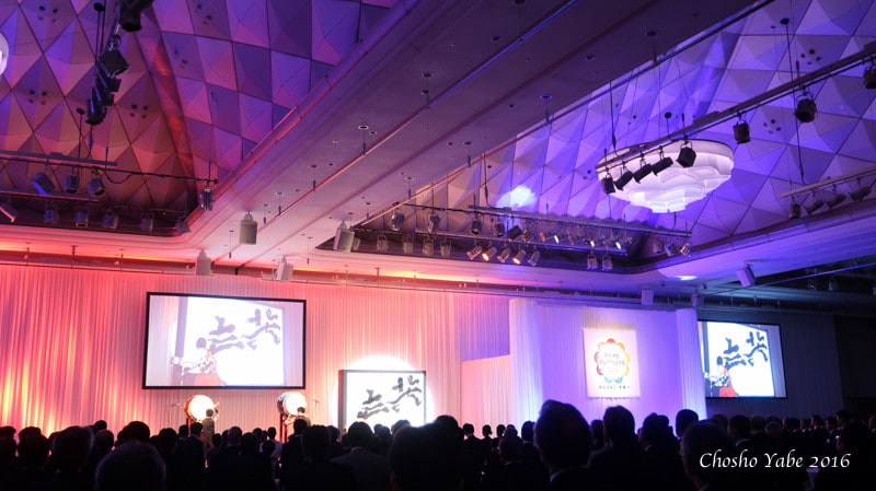 約600名のゲストをお迎えした会場にて、和太鼓の演奏と共に書道パフォーマンスを披露させていただきました。