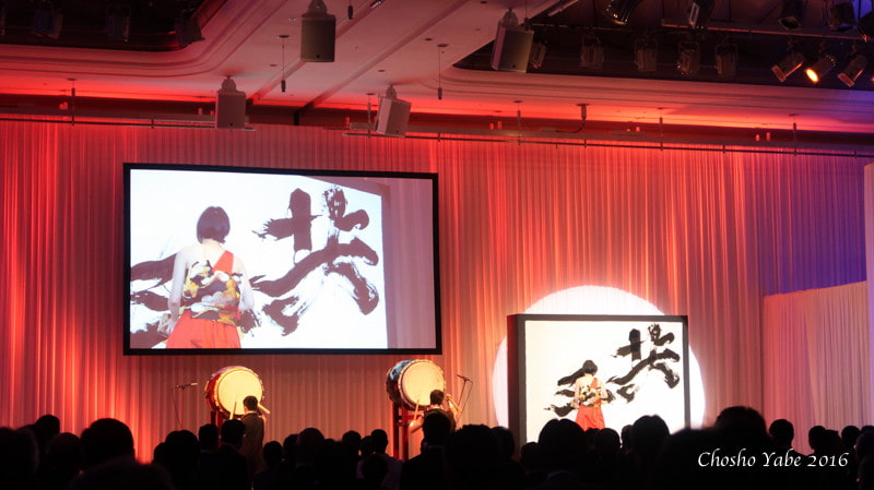 In front of approximately 600 guests, I delivered a calligraphy performance accompanied by the powerful beat of Wadaiko (Japanese drums).
