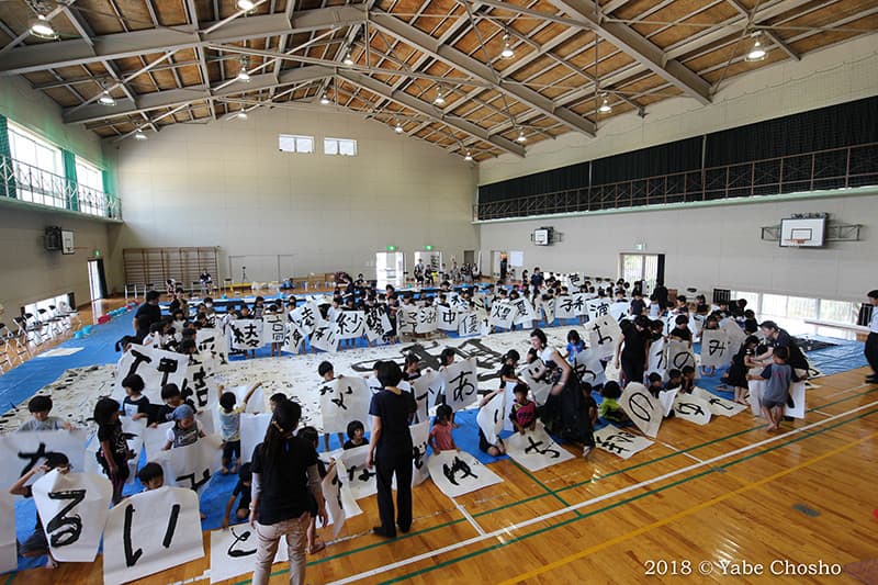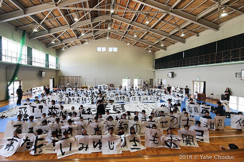 As part of the “Kanonji Children’s Dream Project,” Chosho Yabe held a special lecture and workshop. The event began with a dynamic performance by the artist herself on a massive 10m x 6m paper, capturing the attention of all 300 students.