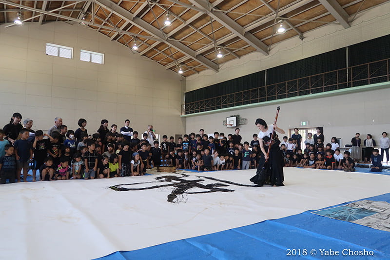 As part of the “Kanonji Children’s Dream Project,” Chosho Yabe held a special lecture and workshop. The event began with a dynamic performance by the artist herself on a massive 10m x 6m paper, capturing the attention of all 300 students.